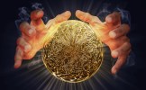 Cropped Image Of Person Holding Illuminated Crystal Ball Against Black Background